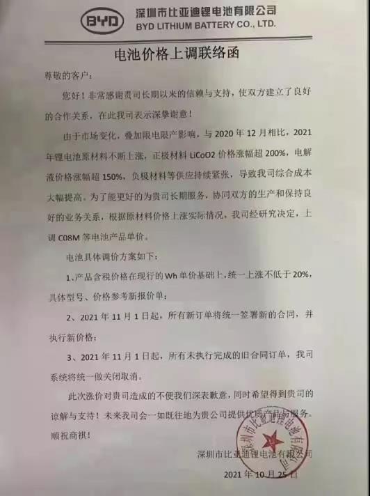 深圳市比亚迪锂电池有限公司电池价格上调联络函尊敬的客户:您好!非常感谢贵司长期以来的信赖与支持,使双方建立了良好的合作关系,在此我司表示深挚谢意!由于市场变化,叠加限电限产影响,与2020年12月相比,2021年锂电池原材料不断上涨,正极材料LiCoO2价格涨幅超200%,电解液价格涨幅超150%,负极材料等供应持续紧张,导致我司综合成本大幅提高。为了能更好的为贵司长期服务,协同双方的生产和保持良好的业务关系,根据原材料价格上涨实际情况,我司经研究决定,上调C08M等电池产品单价。电池具体调价方案如下:1、产品含税价格在现行的Wh单价基础上,统一上涨不低于20%,具体型号、价格参考新报价单:2、2021年11月1日起,所有新订单将统一签署新的合同,并执行新价格;3、2021年11月1日起,所有未执行完成的旧合同订单,我司系统将统一做关闭取消。此次涨价对贵司造成的不便c17官方网站深表歉意,同时希望得到贵司的谅解与支持!未来我司会一如既往地为贵公司提供优质产品与服务。顺祝商祺!深圳市比亚迪锂电池有限公司2021年10月25日