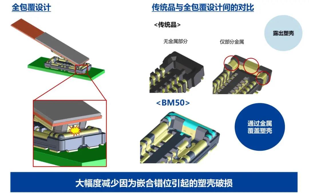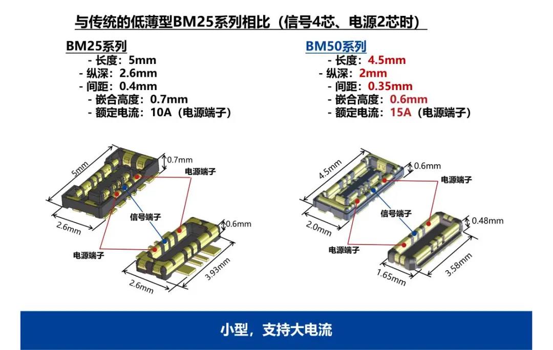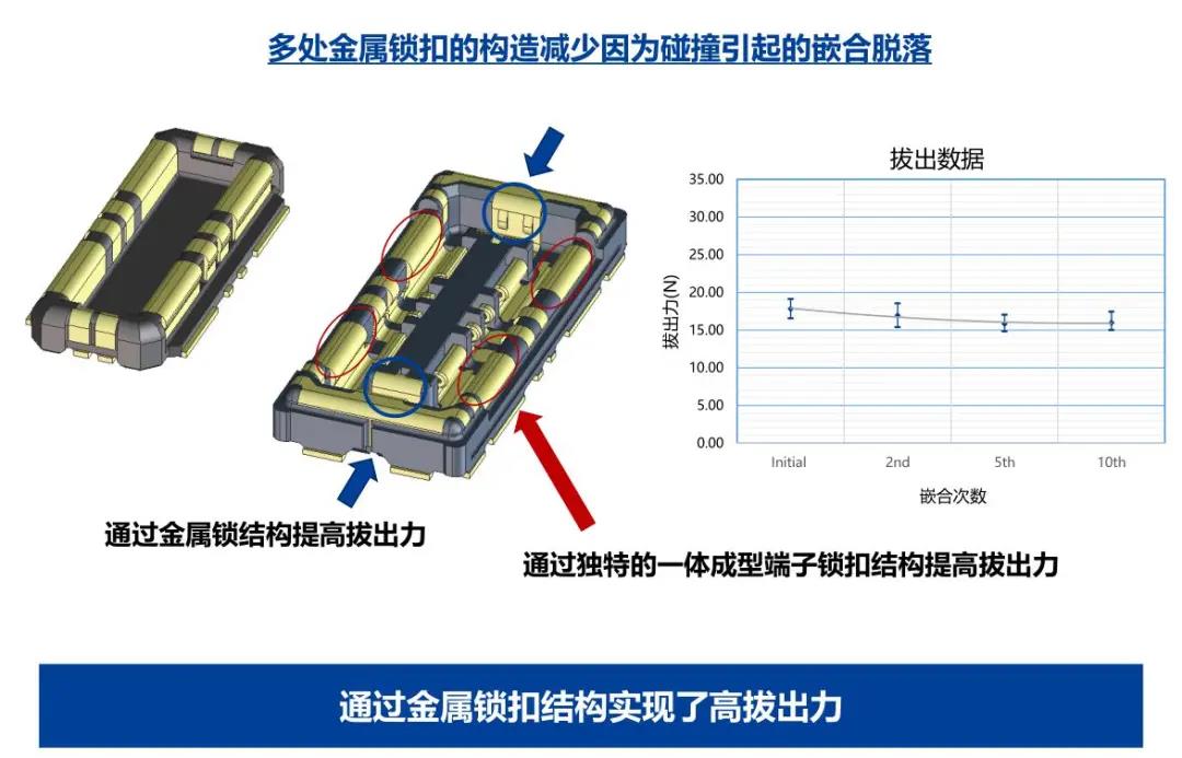 特点 1 兼顾供电能力和小型化的设计 - 额定电流:支持电源端子15A、信号端子0.3A - 嵌合高度:0.6mm、纵深:2.0mm 2 通过全包覆构造,确保高牢固性 3 使接触电阻最小化,节省电力 4 实现小型,高抜出力 5 互相夹紧型多触点构造,确保高接触可靠性 有助于小型化&大电流化