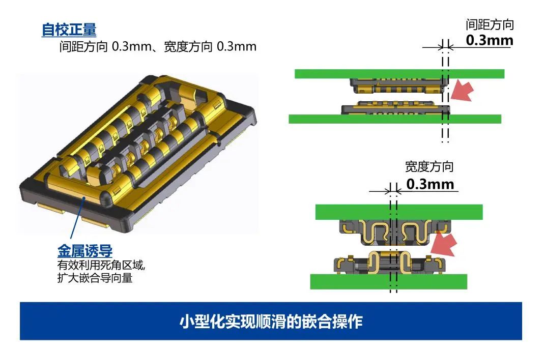 尺寸 省空间 防燥对策 RF特性(连接器单体) RF特性(连接器+FPC) 牢固构造 端子锁扣构造 通过金属诱导实现了较大的自校正量